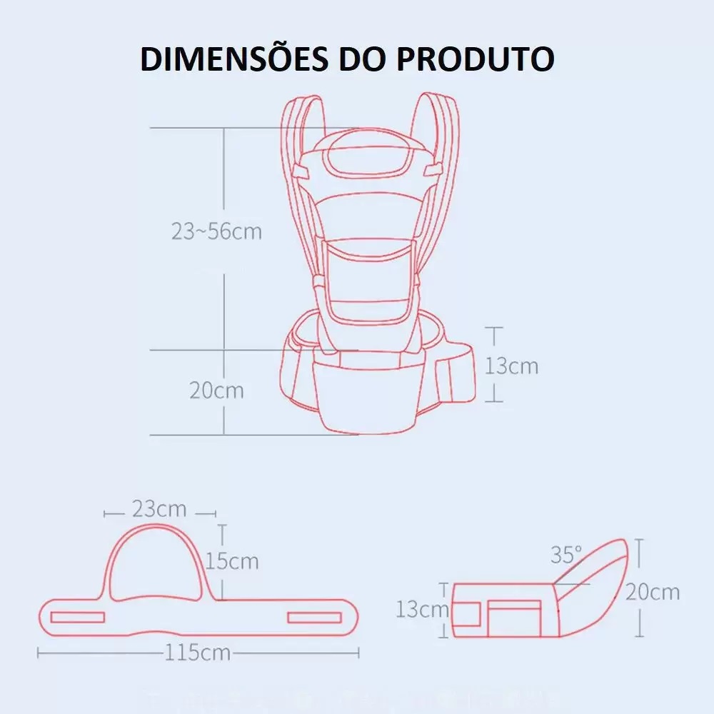 – Fitas largas nos ombros, ajustáveis, acolchoadas e respiráveis que permitem o melhor ajuste ao condutor. Serve tanto para o papai quanto para a mamãe!