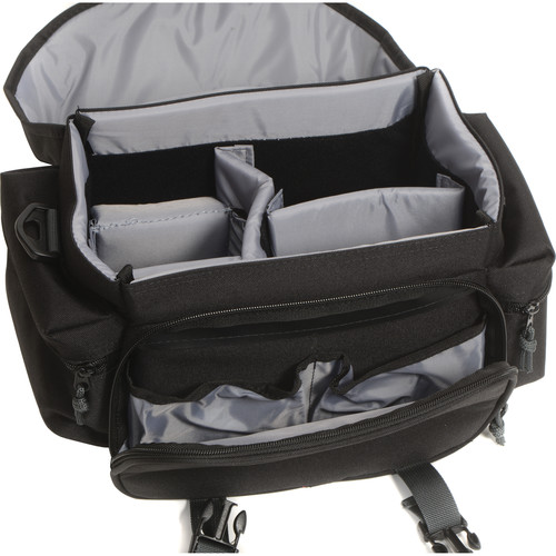 Em cada extremidade da bolsa há um bolso acolchoado com zíper para acessórios de tamanho médio, como uma unidade de flash. A bolsa é facilmente transportada com duas alças superiores que podem ser unidas por um conector de toque ou com uma alça de ombro removível de 1,5 “de largura. Uma alça de ombro ajustável, pode ser usada diretamente para baixo ou transversalmente ao peito. Para maior conforto, a bolsa a alça de ombro tem uma almofada deslizante e contornada com uma parte inferior antiderrapante. O melhor de tudo é que os mosquetões das alças se conectam a um receptor de plástico afixado à bolsa com uma alça de náilon de 1,5” de largura, que passa contígua de um lado da bolsa. a bolsa para a outra – adicionando resistência e reduzindo bastante a possibilidade de falha da alça. A bolsa repousa sobre dois pés de plástico, que protegem o fundo da sujeira e da umidade. Construída em náilon repelente à água, a bolsa é forte e durável.