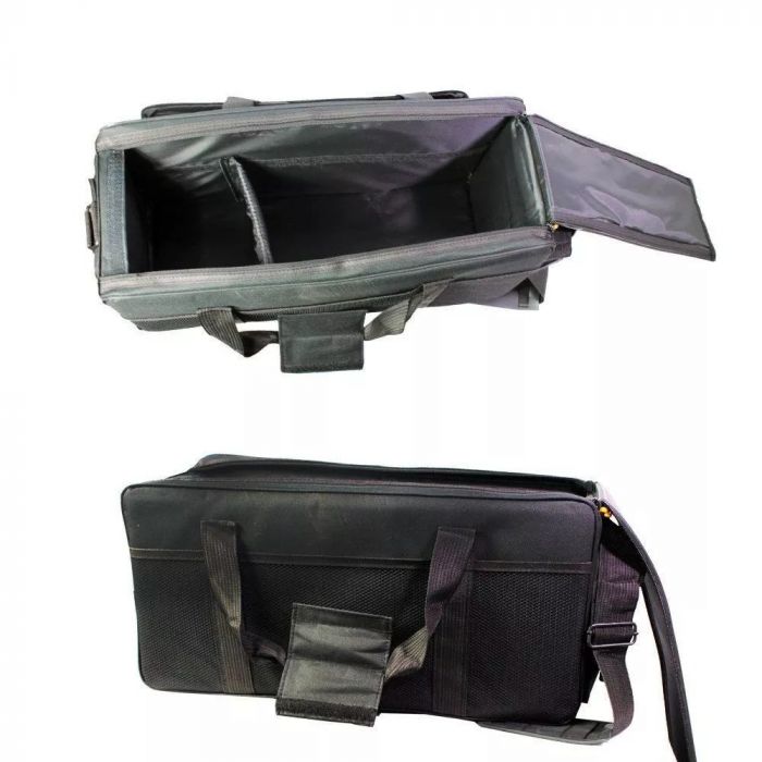 Bolsa prática para o transporte de Filmadoras, máquinas fotográficas flash e acessórios. Possui três bolsos. Compartimento externo de telinha. O compartimento principal possui divisórias internas fixadas que podem ser reposicionadas ou até mesmo retiradas.