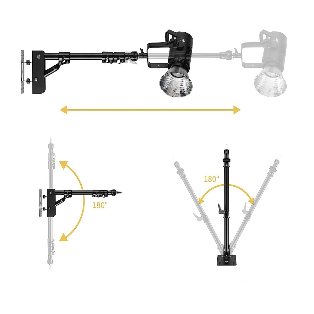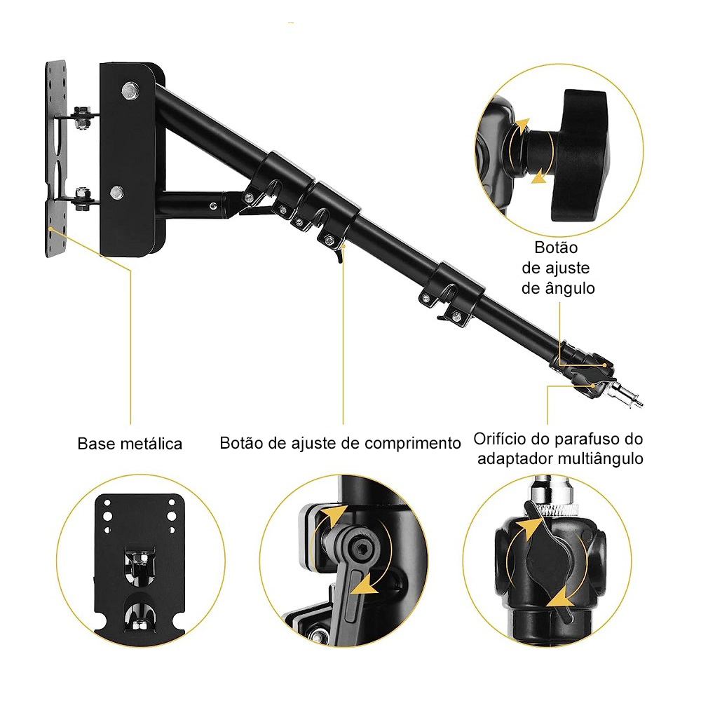 Este braço boom para montagem em parede é perfeito para suportar equipamentos como Tocha, flashes, guarda-chuvas e refletores.