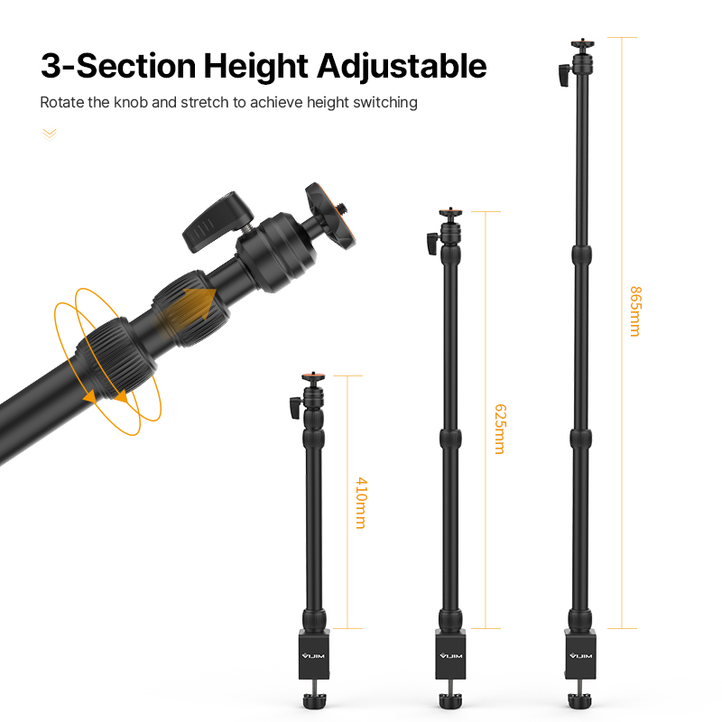 O suporte de luz de mesa LS10 foi projetado com 3 seções estendendo os postes com altura ajustável de 13 “-33” / 35,4 cm-90 cm, o que oferece a possibilidade de filmagens e iluminações suspensas. Uma porca de asa de anel de borracha ajuda você a fixar o poste com mais facilidade.