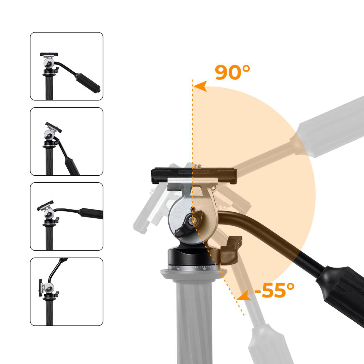 Esta plataforma líquida possui função de amortecimento fixa para proporcionar uma experiência operacional suave. Usando uma cabeça de amortecimento com cabeça de tripé, você pode inclinar +95°/-55° e girar 360° para fotografar em vários ângulos.