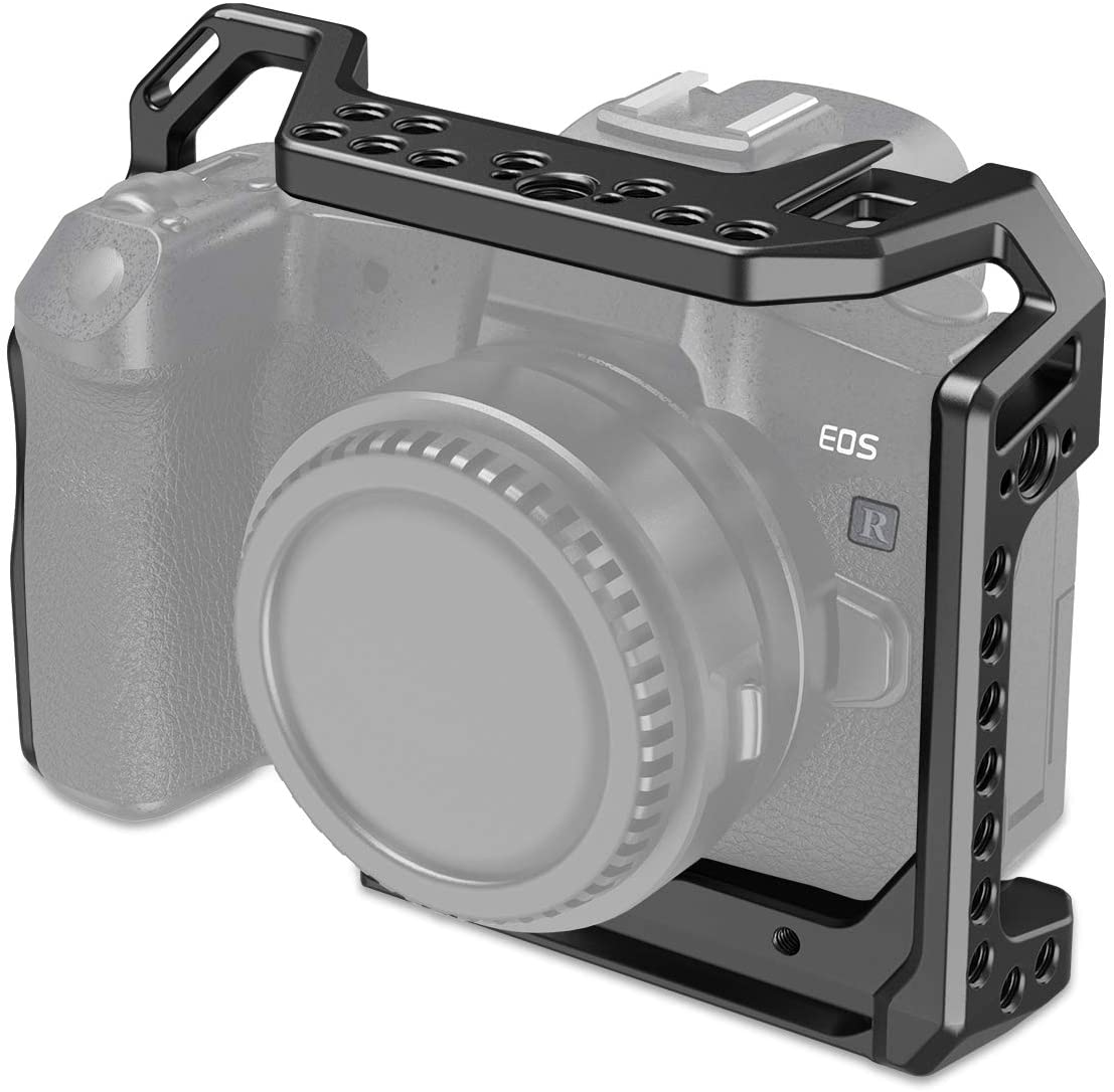 SmallRig CCC2803 é uma gaiola de formação completa projetada para fornecer proteção e acessórios para sua câmera. A gaiola se conecta à parte inferior da câmera por meio de um parafuso de 1/4 “-20 e possui dois pinos anti-torção. Ela vem com vários orifícios roscados de 1/4” -20 e 3/8 “. -16, roscas de acessórios para ARRI e uma sapata fria, permitindo a montagem de acessórios. Por exemplo, você pode montar SmallRig Top Handle 2165B ou SmallRig 2093 Wood Side Handle para disparo manual; montar SmallRig Ball Head Magic Arm 2070 ou SmallRig Monitor Holder 1842 para conectar um monitor. SmallRig Cable Clamp 1822 para proteger o cabo e a porta HDMI. Se você usar o adaptador de montagem de lente EF-EOS R, você pode usar SmallRig BSA2696 para suportar o suporte e o alívio de pressão das lentes pesadas. em placa Arca-Swiss QR e chave de fenda plana na parte inferior.