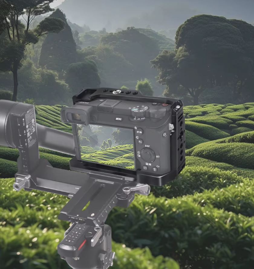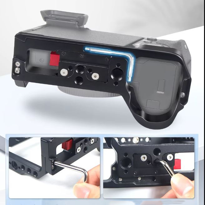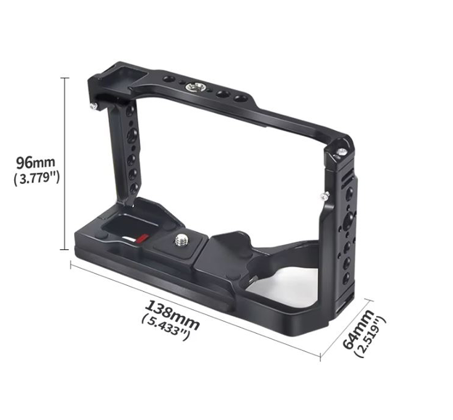 Apresentando o suporte de câmera, feito sob medida para a câmera DSLR Sony A6700. Feito de alumínio de nível aeroespacial, este suporte de vídeo apresenta um design usinado em CNC de precisão com um acabamento elegante em preto e vermelho. Suas dimensões compactas de 138x96x64 mm são projetadas para manuseio intuitivo e fácil transporte. Apresentando uma placa de liberação rápida tipo Arca integrada, uma chave sextavada de dupla finalidade em forma de L para fácil montagem e uma variedade de opções de montagem, incluindo sapata fria e trilho NATO, este suporte de câmera é o companheiro perfeito para sua Sony A6700 para melhorar a estabilidade e a expansibilidade da filmagem.