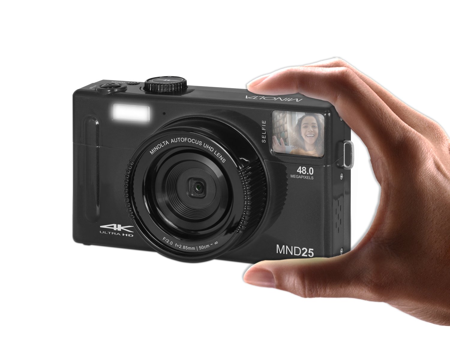 A câmera digital MND25 tira fotos de 48 MP e vídeos 4K Ultra HD. Ela possui um tamanho compacto, lente com zoom digital de 16x e tela LCD de 3,0”. Recursos especiais, incluindo detecção de rosto, captura de sorriso, temporizador e modos de cena inteligentes, tornam a captura da foto perfeita divertida e fácil. O espelho de selfie integrado na parte frontal da câmera ajuda você a tirar a selfie perfeita sempre.