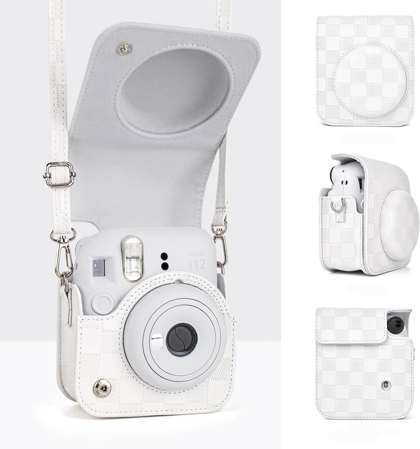 Feito de superfície de couro sintético premium com aparência especial em estilo xadrez, interior de microfibra superfino, este estojo para mini câmera instax parece bastante durável e oferece proteção total para sua câmera Fuji Mini 12 longe de arranhões, poeira, impactos e desgaste geral e rasgar