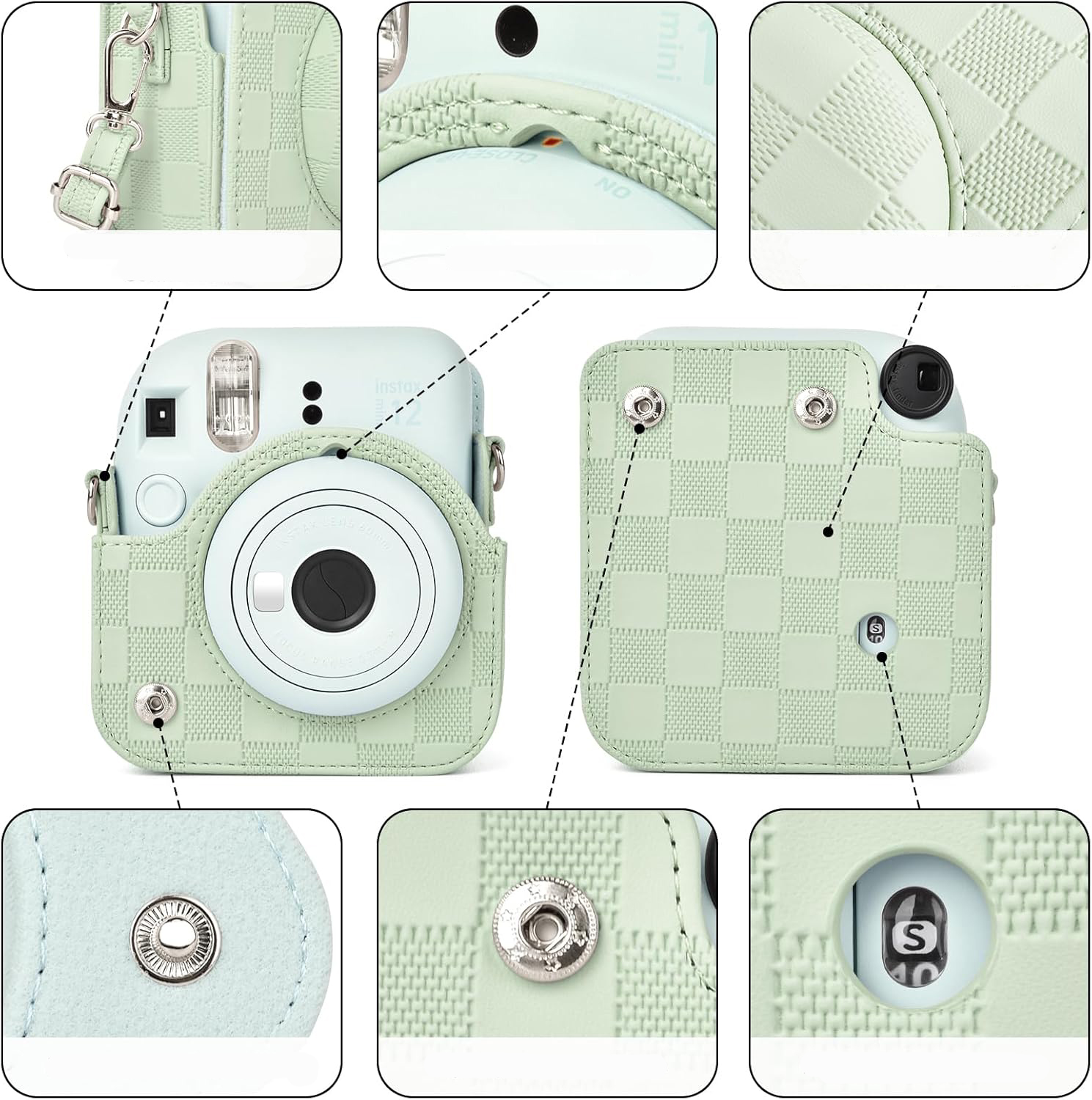 Feito de superfície de couro sintético premium com aparência especial em estilo xadrez, interior de microfibra superfino, este estojo para mini câmera instax parece bastante durável e oferece proteção total para sua câmera Fuji Mini 12 longe de arranhões, poeira, impactos e desgaste geral e rasgar