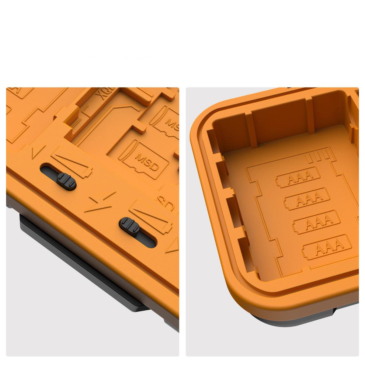 O sistema de travamento ergonômico permite fácil abertura e fechamento. Cada slot é estritamente personalizado para caber perfeitamente no cartão e na bateria. O fecho selado evita infiltração de água e fornece proteção total para sua bateria