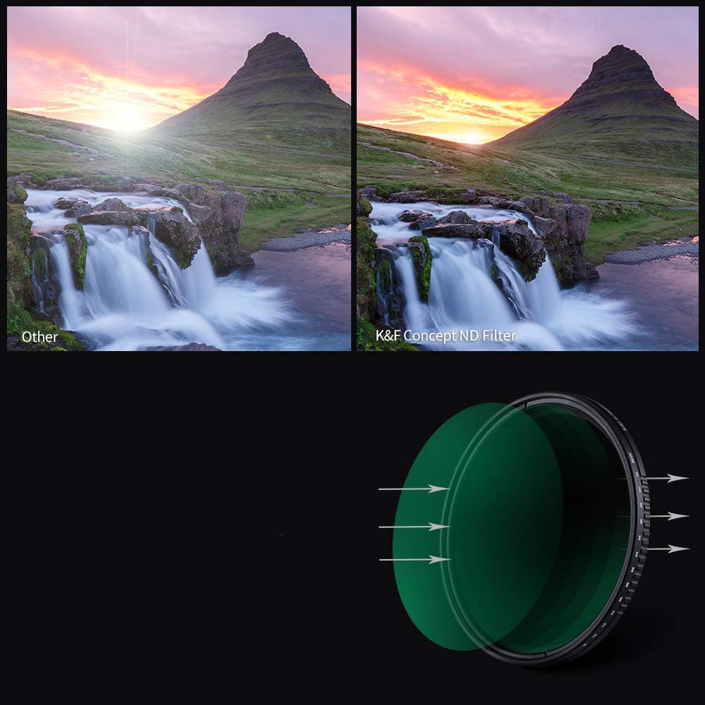 Este filtro ND variável Nano-D de 3 a 11 pontos com revestimento multirresistente da KF Concept é um filtro de densidade neutra variável de 49 mm que fornece uma redução de luz ajustável de 3 a 11 pontos. Ele escurece toda a área da imagem uniformemente, permitindo que uma fotografia seja feita com uma velocidade de obturador mais lenta ou uma abertura maior sem superexpor a imagem. Diminuir a velocidade do obturador aumenta a exposição, possibilitando aumentar o desfoque da imagem para enfatizar o movimento, como ao fotografar água corrente. Alternativamente, ao aumentar a abertura, fornece um controle mais fino sobre a profundidade de campo, útil ao tentar isolar o assunto. Este filtro ajustável é especialmente útil ao fotografar paisagens e em condições de luz muito brilhantes, e é útil para imagens estáticas e de vídeo.