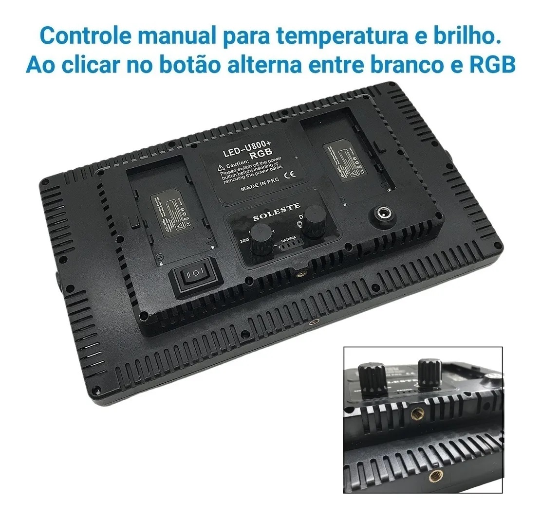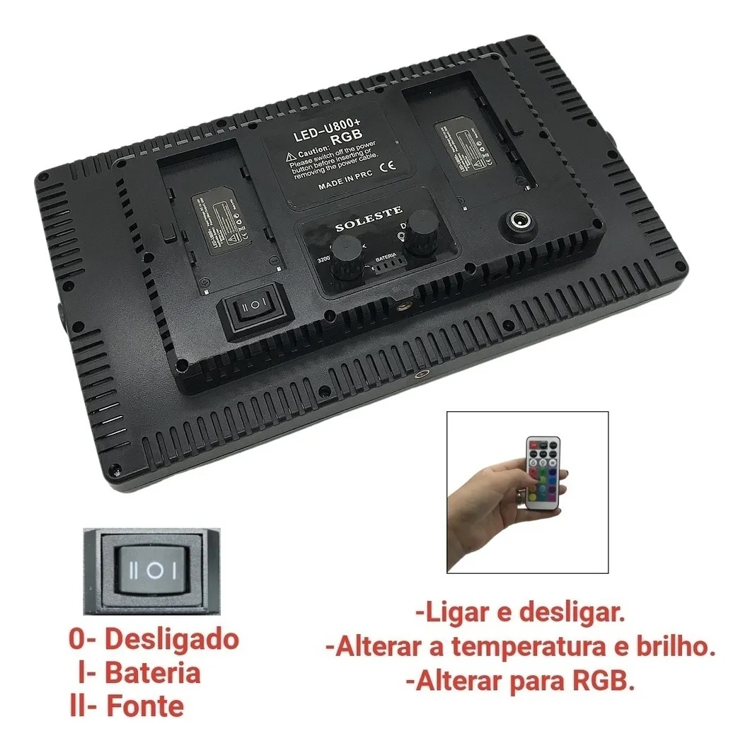 Transforme suas produções audiovisuais com o Iluminador de LED Soleste U800+ RGB! Com 50W de potência e 1120 LEDs, este iluminador profissional proporciona uma luminosidade intensa e versatilidade, com ajustes de temperatura de cor que variam de 3200K a 5600K, além de uma ampla gama de cores RGB.