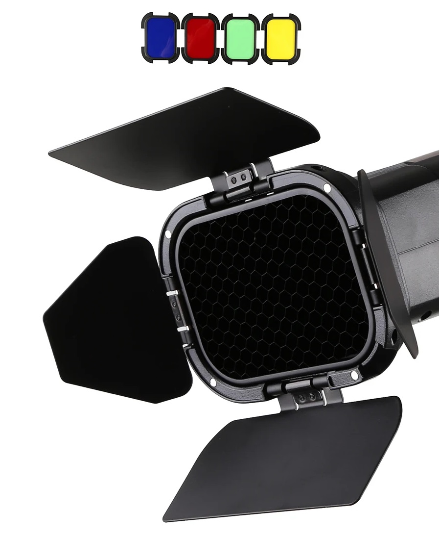 Kit composto por abas barndoors, grid (removível) e 4 filtros Gelatina coloridas.