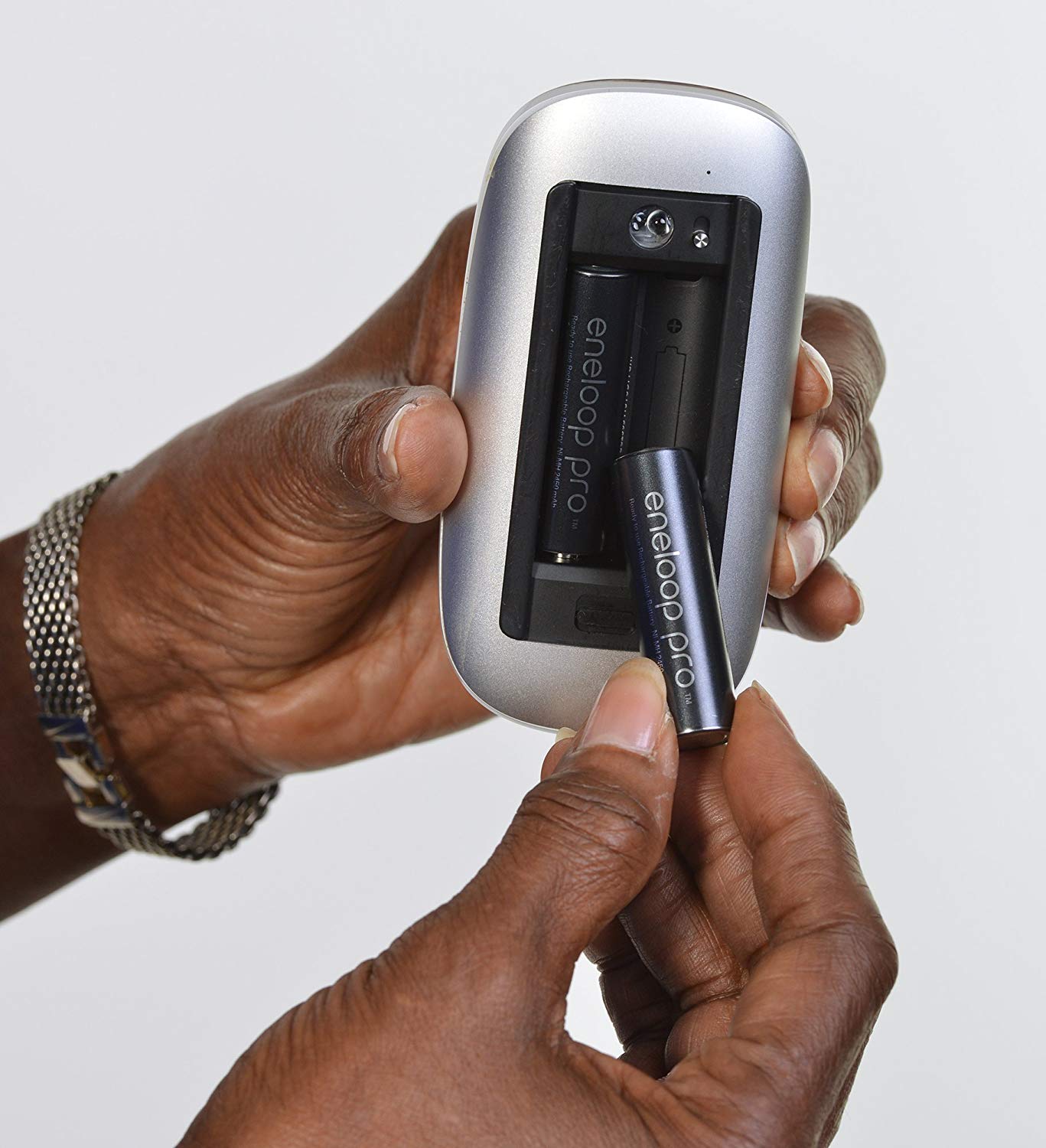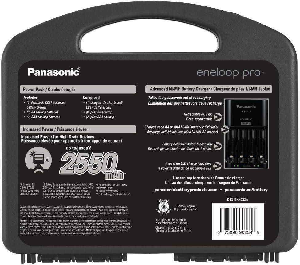 Potencie vários equipamentos eletrônicos, incluindo câmeras digitais e dispositivos de jogos, usando o pacote de energia de alta capacidade pro da Panasonic, que agrupa seu carregador BQ-CC17 de 4 compartimentos com baterias AA 8x e AAA NiMH 2x. Os AAs possuem 2550mAh de capacidade, enquanto os AAAs têm 950mAh. Todas as células vêm pré-carregadas e oferecem 1,2V de potência de saída. Graças à sua taxa muito baixa de auto-descarga, as baterias retêm até 85% de sua carga após 1 ano de armazenamento. Eles também podem ser recarregados até 500 vezes.