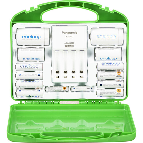 Este Eneloop Power Pack Kit da Panasonic inclui um carregador de 4 posições, 8 pilhas AA e 2 AAA recarregáveis, bem como dois espaçadores C e D e uma maleta de transporte.