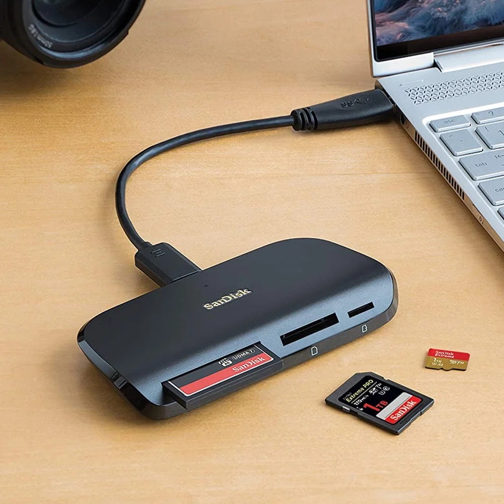 O leitor de cartões múltiplos SanDisk ImageMate PRO USB-C funciona com os formatos de cartão mais populares, incluindo: SDHC e SDXC, microSD e CompactFlash.
