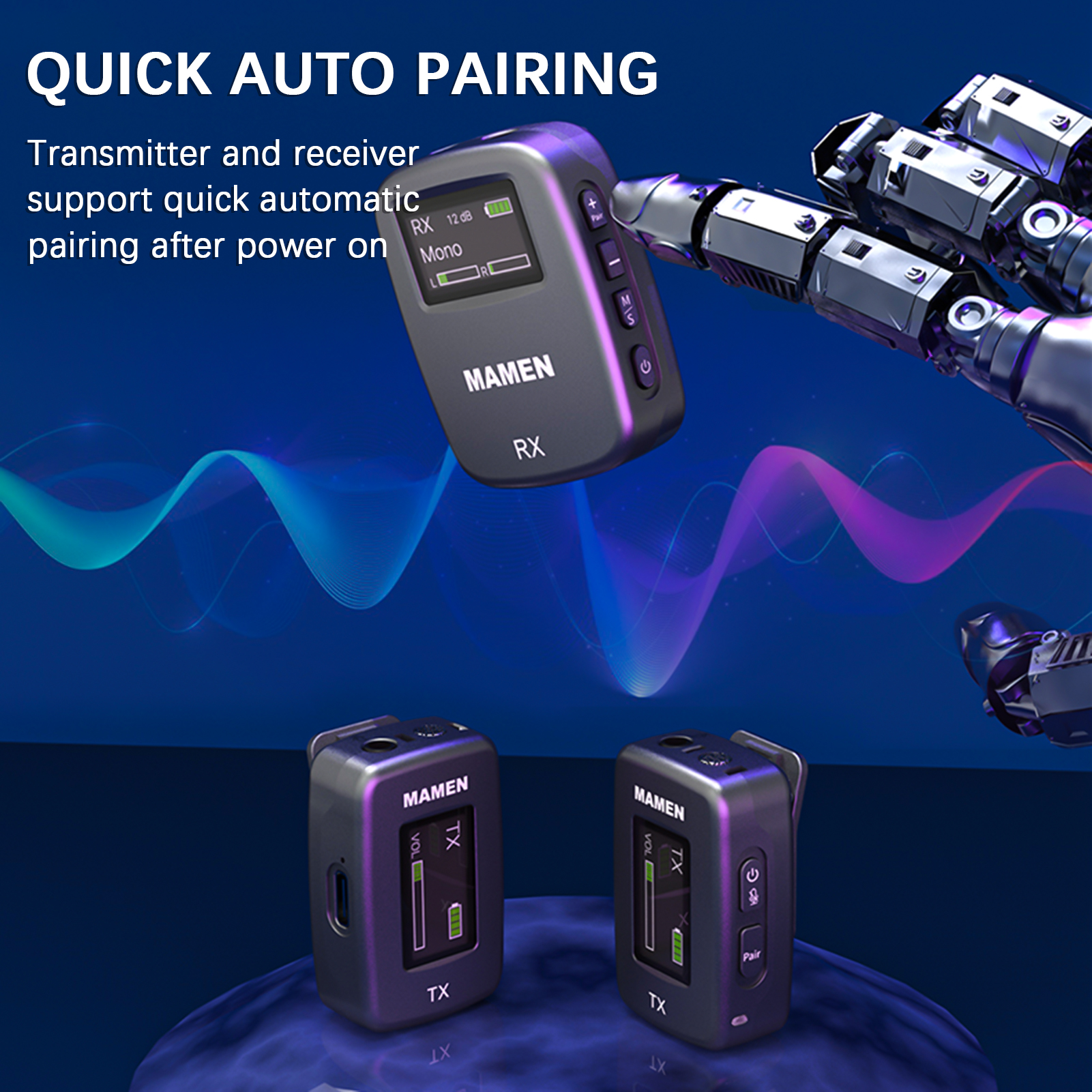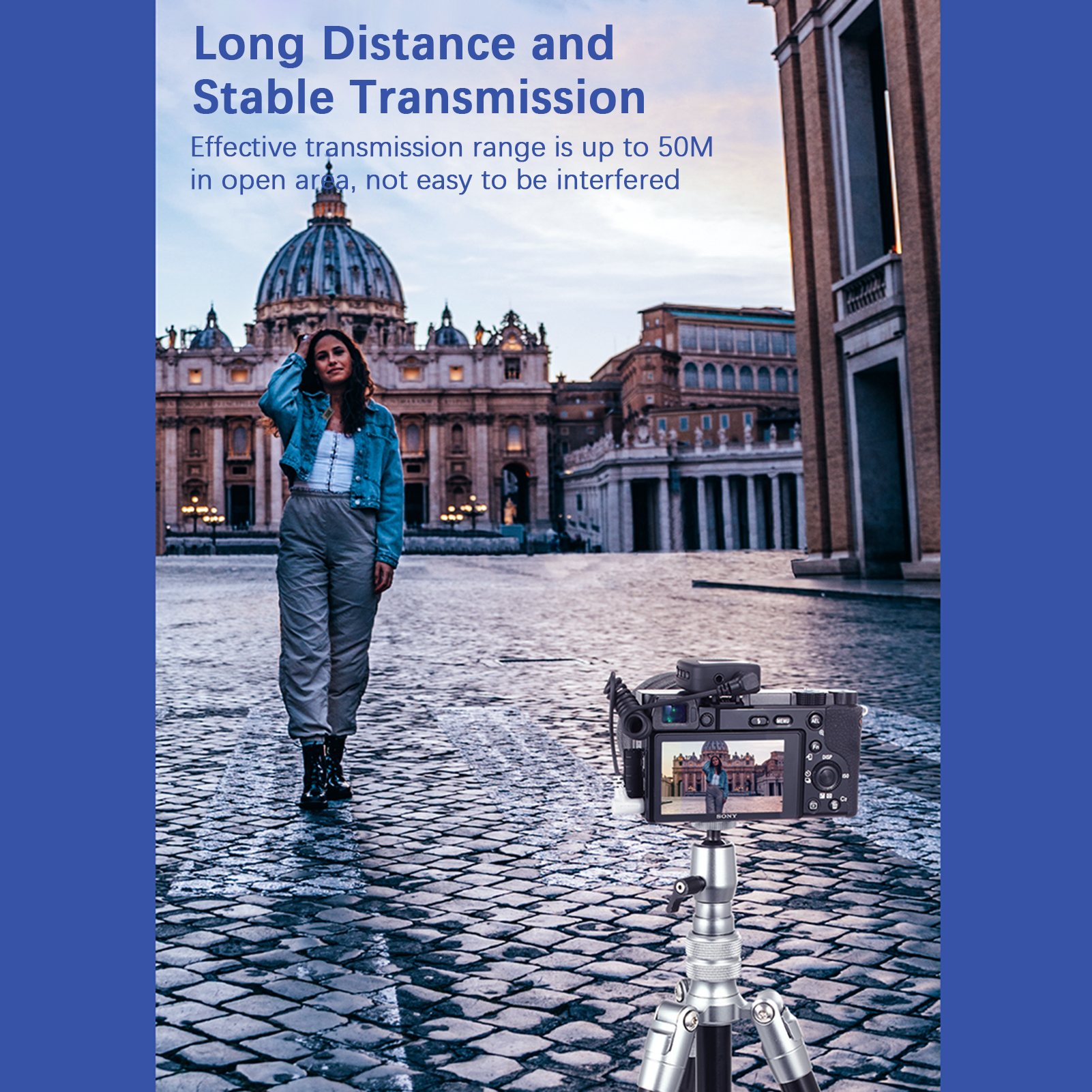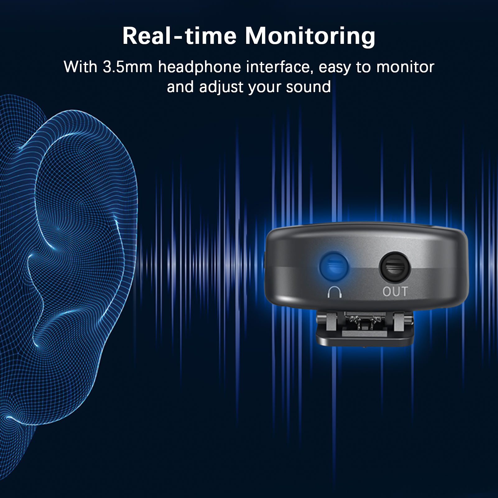 Adota a tecnologia de transmissão sem fio 2.4G, forte interferência, transmissão de sinal estável e som estéreo nítido. Suporta monitoramento em tempo real de fone de ouvido de 3,5 mm e função de mudo com um botão.