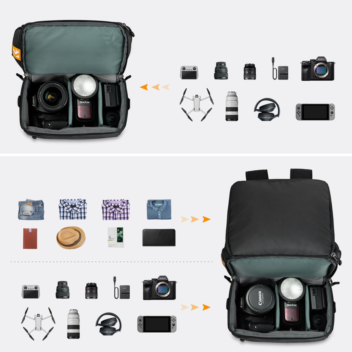 Ao usar a bolsa como uma estilingue, você pode retirar seu equipamento de câmera rapidamente para capturar o momento maravilhoso. Ao usar a bolsa como mochila, você pode colocar suas roupas no compartimento superior e o equipamento fotográfico no compartimento inferior.