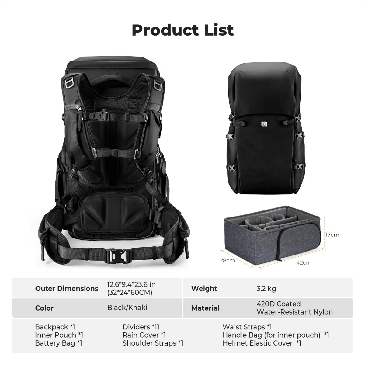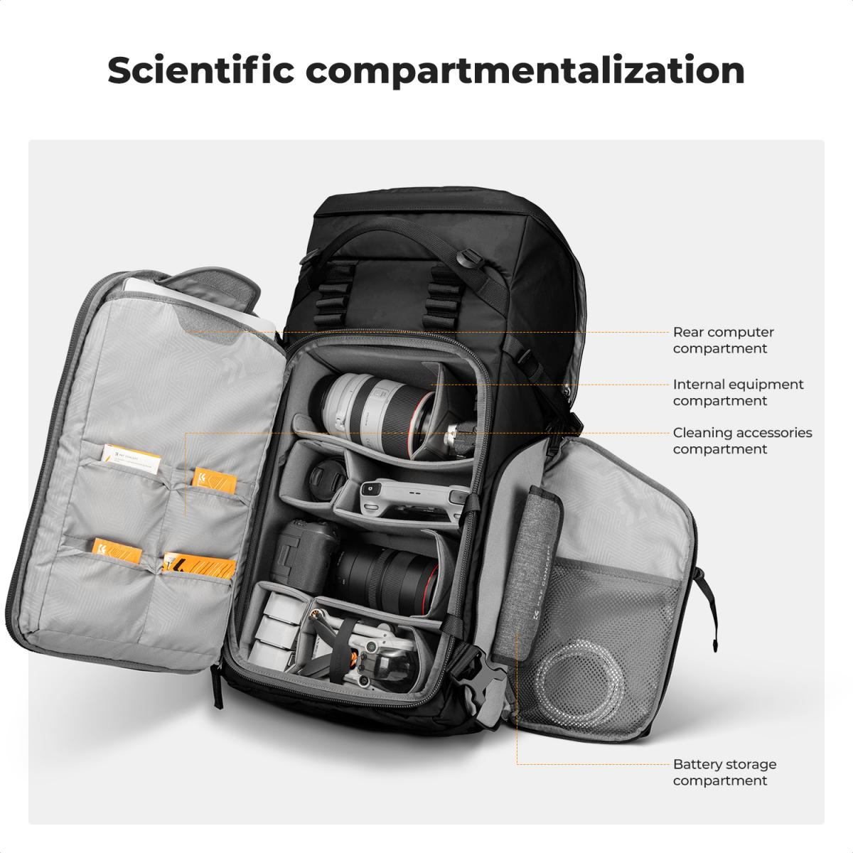 O compartimento superior comporta roupas, o bolso interno com zíper acomoda celulares, baterias, cabos e outros acessórios, e o compartimento principal inferior comporta câmeras, drones e outros itens. Os 8 divisores podem ser combinados livremente de acordo com o equipamento fotográfico para atender a diferentes necessidades. Possui também um bolso na cintura, compartimento frontal elástico, bolsos laterais, bolso interno e compartimento para laptop para armazenamento multifuncional de acessórios.