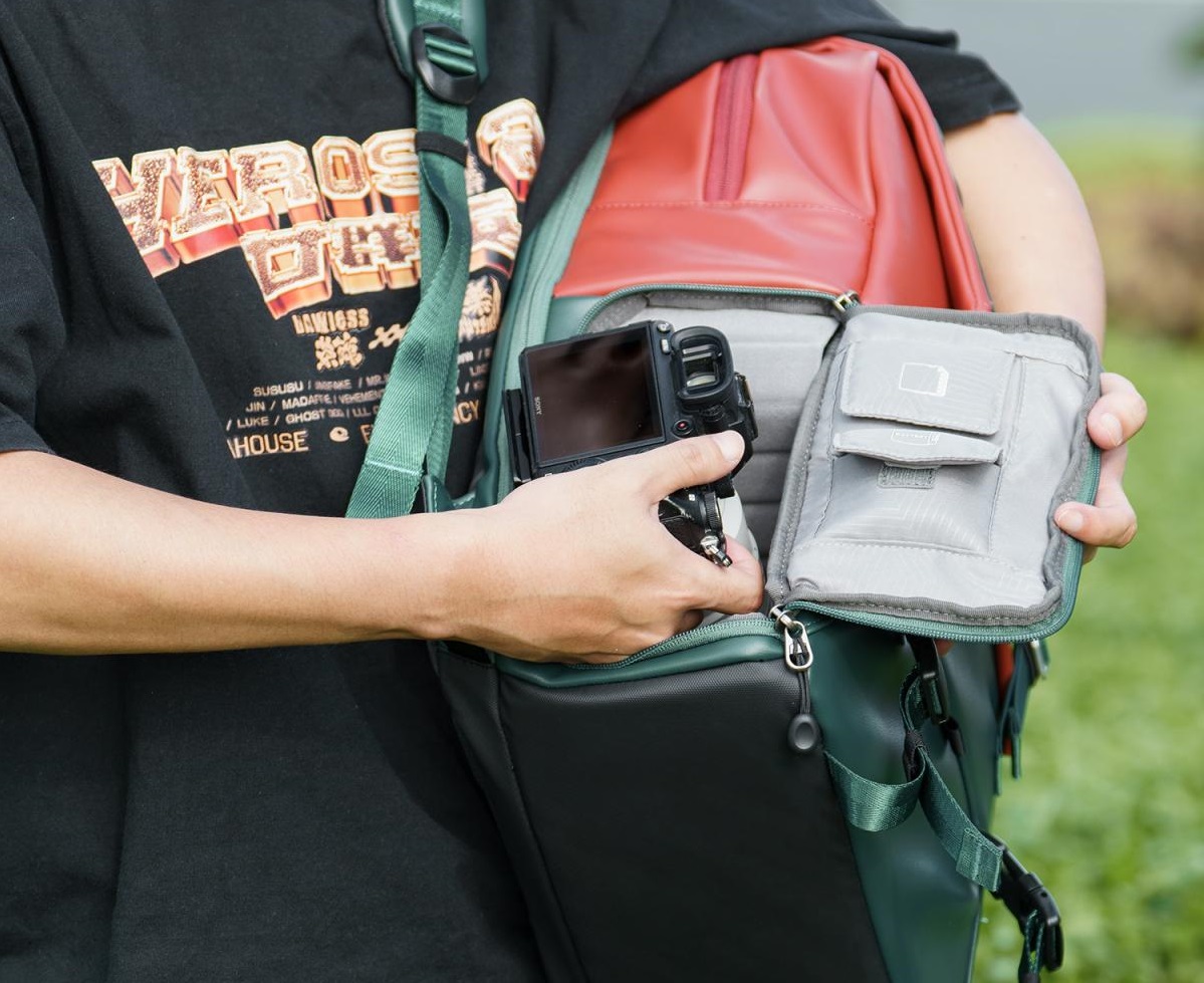 Bolsos internos especiais projetados para armazenar peças sobressalentes fotográficas, como filtros, anéis adaptadores, etc. Bolso frontal oculto para armazenamento diário de acessórios. Os bolsos laterais podem transportar garrafa de água ou guarda-chuva.