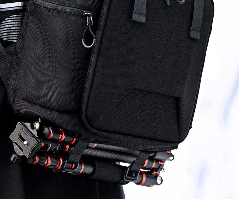 Com alças de fixação do tripé na parte inferior, é mais fácil transportar o tripé para fotografia ao ar livre. E a alça elástica traseira permite que você fixe a bolsa da câmera na alça da mala do carrinho, mais conveniente para viagens.