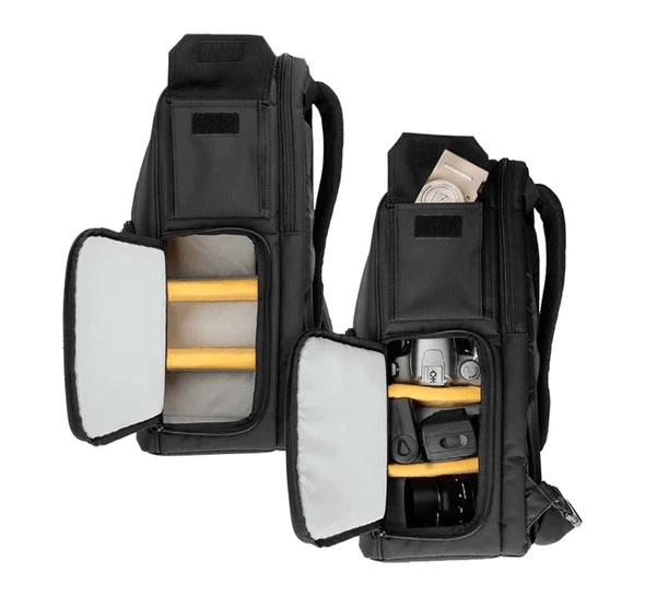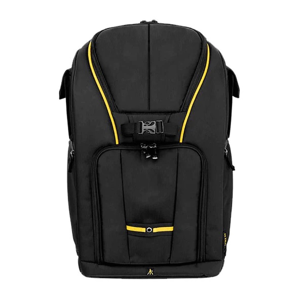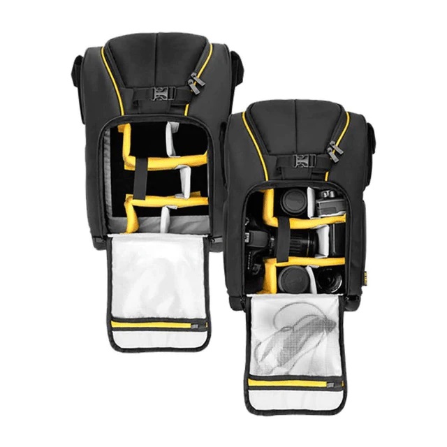 Possui em sua parte frontal, uma cinta e um apoio para acomodação de um tripé, deixando você livre para longas caminhadas. Com divisórias removíveis e reajustáveis por velcro.