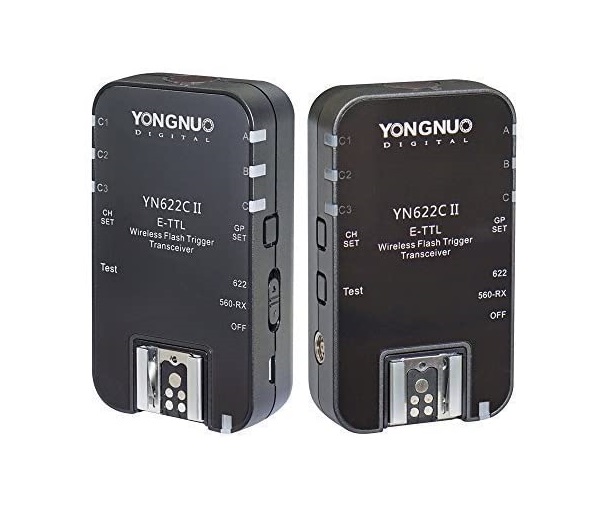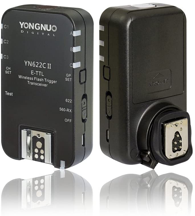 YN-622C E-TTL II Flash sem fio transceptores de YONGNUO é compatível com câmeras Canon E-TTL / E-TTL II. O transceptor desliza diretamente no sapato quente e utiliza uma frequência de 2,4 GHz com um alcance de 328 ‘para acionar os flashes remotos montados no outro transceptor.