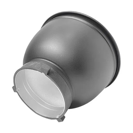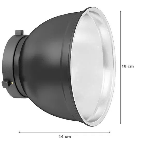 Panela refletora para Flash de Estúdio com Montagem Bowens 180mm de diâmetro Godox RFTO Refletor conta com encaixe do tipo padrão bowens para ser usado em flashes, tochas de estúdios fotográficos.