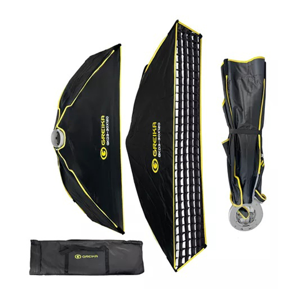 Softbox Dobrável Greika Strip light COM TELA GRID COLMEIA e encaixe PADRÃO BOWENS de 30cm de largura por 120 cm de comprimento e 38 cm de profundidade.
