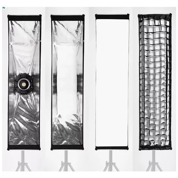 O Softbox Strip 30x120cm com colmeia Bowens de Montagem rápida retangular, oferece melhor controle sobre o feixe de luz e as imagens são mais contrastantes, embora a suavidade de iluminação característica das softboxes ainda esteja presente. A construção da softbox é baseada em um anel metálico, responsável pelo aperto forte e uniforme da tela.