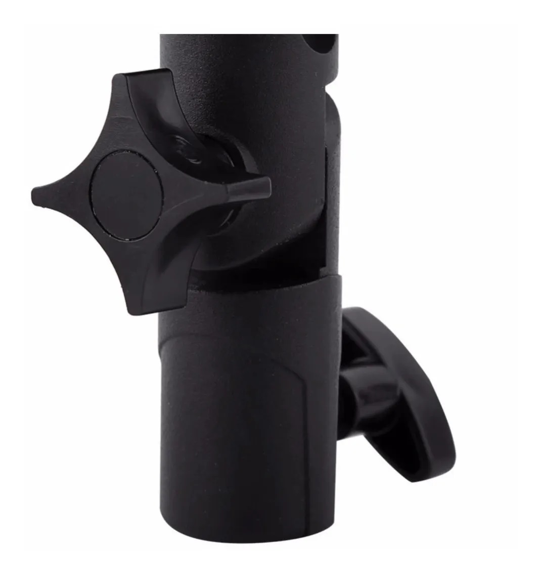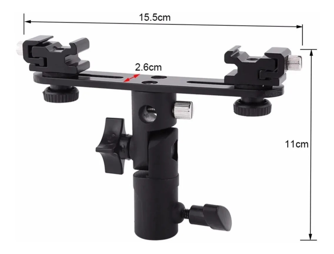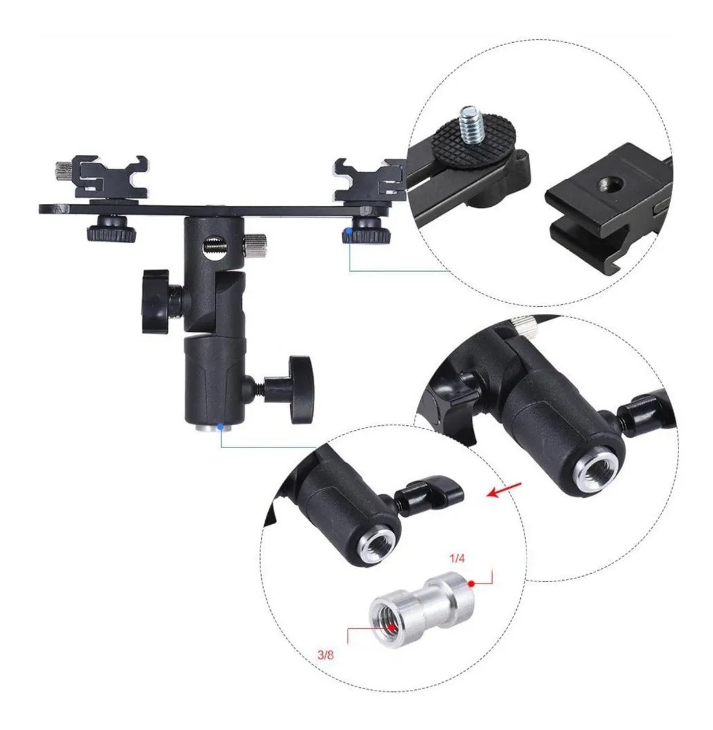 O suporte de Flash Duplo com duas sapatas (ajustáveis) pode ser usado com flash e guarda-chuva ao mesmo tempo, ajuste a montagem de modo que esteja em um ótimo ângulo para obter ótimos resultados fotográficos.
