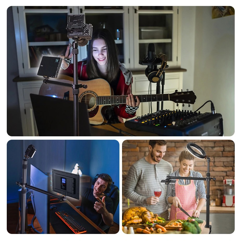 O suporte com grampo de mesa com parafuso de 1/4 padrão pode ser montado para a maioria das câmeras e luzes que têm um adaptador de 1/4 de polegada, como luz de anel, câmera DSLR, câmera de ação, luz de vídeo, câmera de vídeo, luz de painel, mini projetor. Cabeça de esfera giratória com rotação de 360 graus é perfeita para ajuste de ângulo