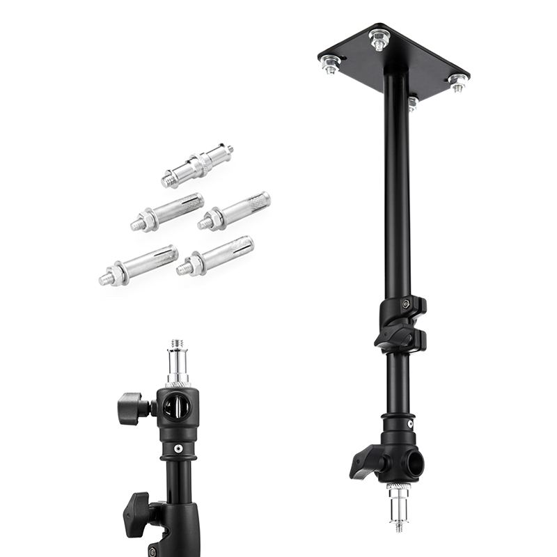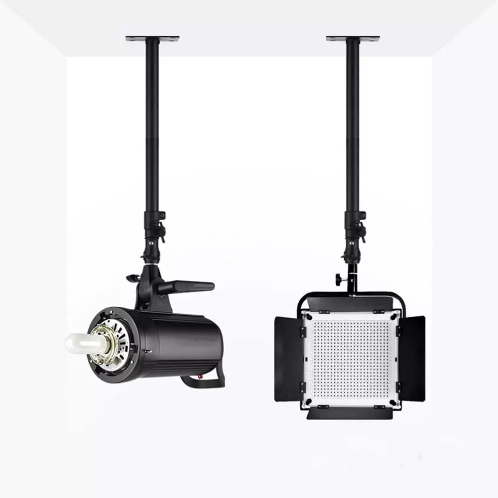 Com o Suporte de Iluminação ajustável podem ser fixados no chão ou teto do seu estúdio fotográfico, reduzindo e aproveitando o espaço ocupado, são amplamente utilizadas em filmes e fotografias para iluminação de luzes suspensas de ar, o ângulo alto pode ser ajustado, para preencher uma perspectiva mais ampla.