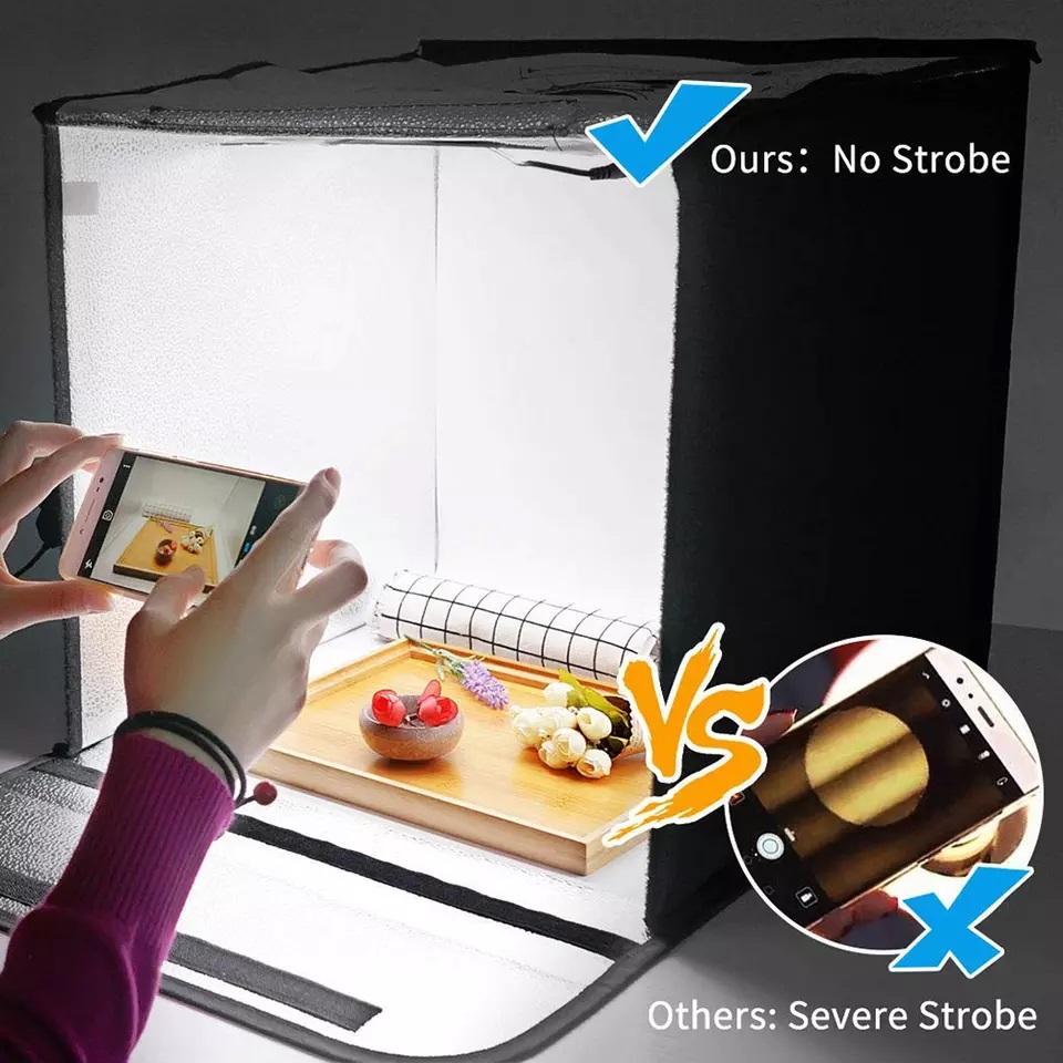 O kit conta com uma caixa de tamanho com superfícies internas refletoras e luz de LED no topo. Isso garante que a luz se espalhe por dentro da caixa de maneira uniforme.