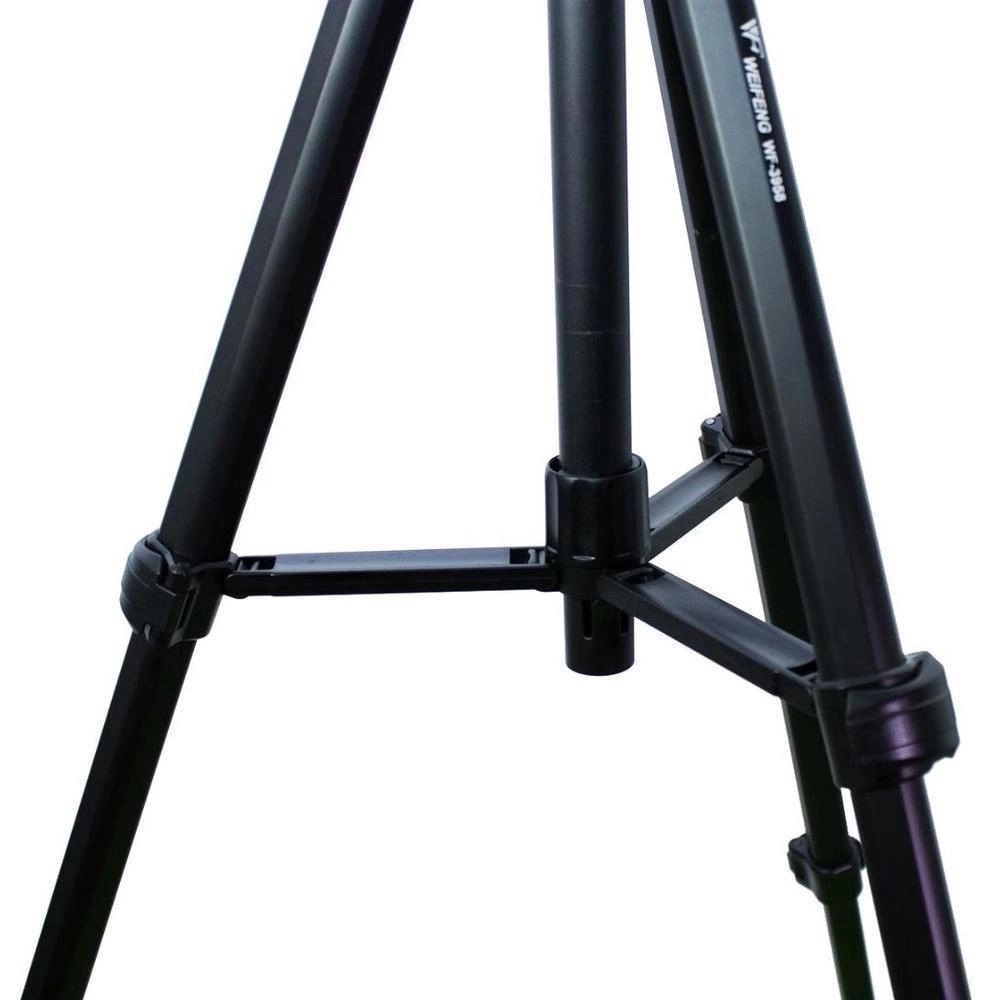 A estrutura do Tripé Weifeng WT-3958 possui pernas de 4 seções em alumínio, 3 travas de plástico resistente em cada perna, uma trava na coluna central, pés emborrachados adaptáveis e dois níveis tipo bolha para auxiliar em ambientes desnivelados, uma manivela para levantar a cabeça e uma manopla ajustável em 360º.