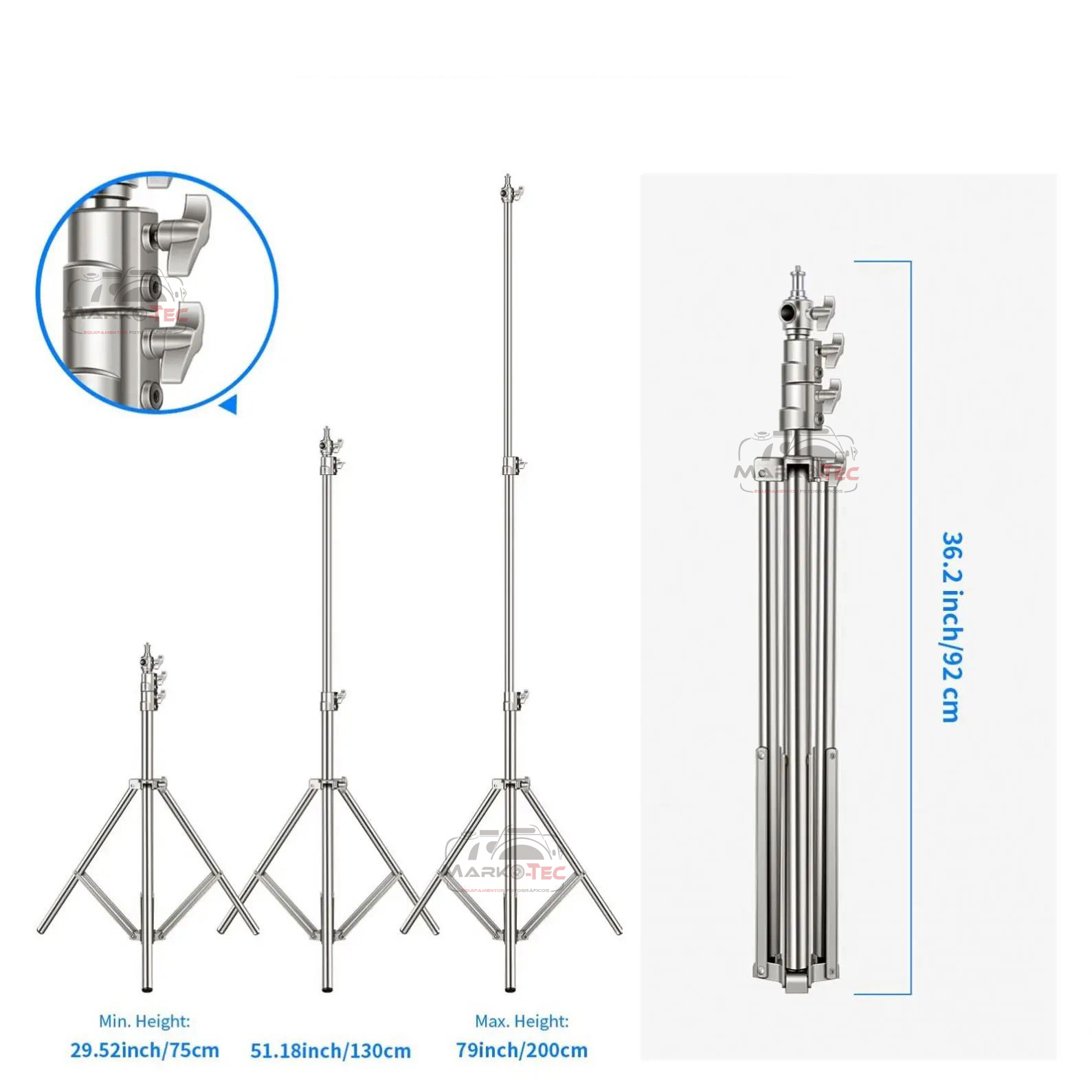 A altura ajustável varia de 40 polegadas/100 centímetros a 110 polegadas/280 centímetros; Suas sólidas capacidades de travamento garantem a segurança do seu equipamento de iluminação quando em uso.