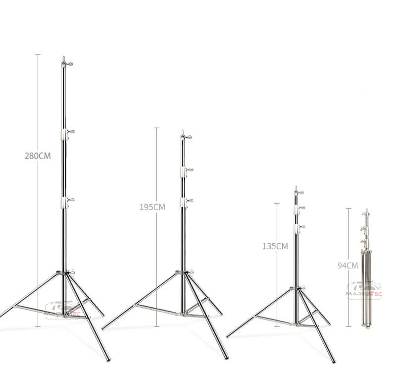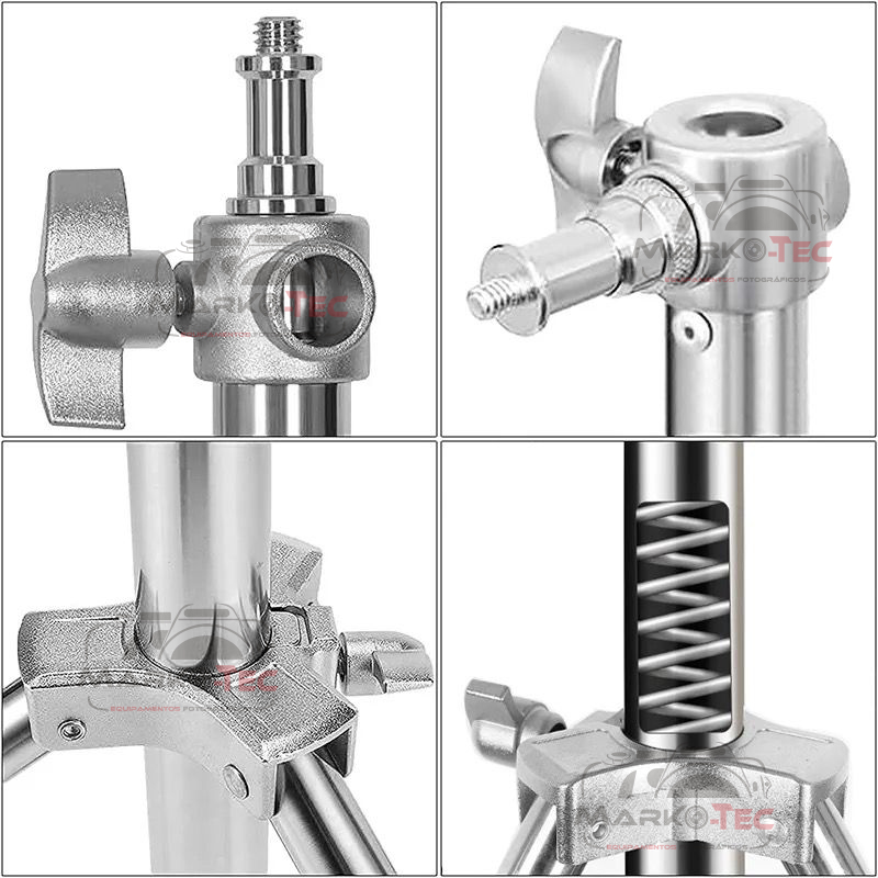Tripé de aço inoxidável para serviços pesados. É utilizado para montagem de luzes estroboscópicas, refletores, guarda-chuvas, softboxes e outros equipamentos fotográficos;
