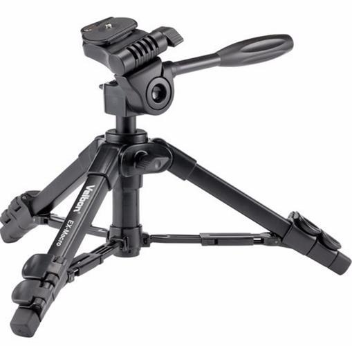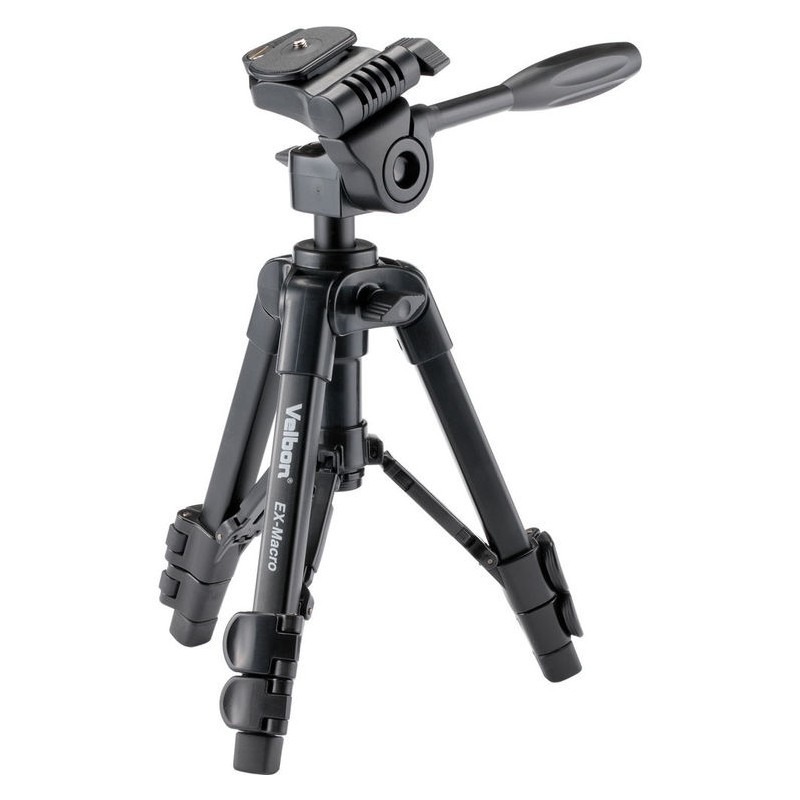 O Velbon EX-Macro é um tripé de mesa leve, pequeno e equipado com uma cabeça de movimentos pan e tilt.