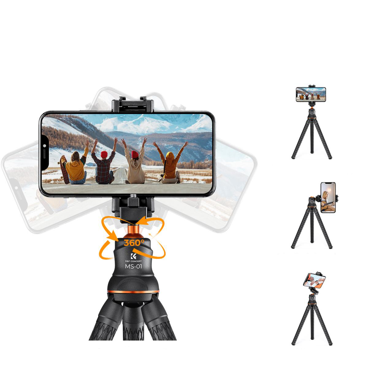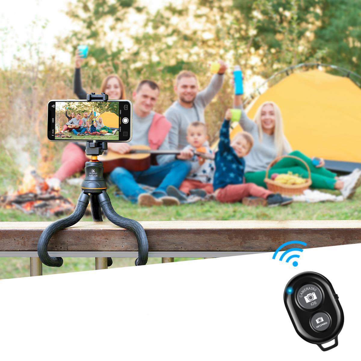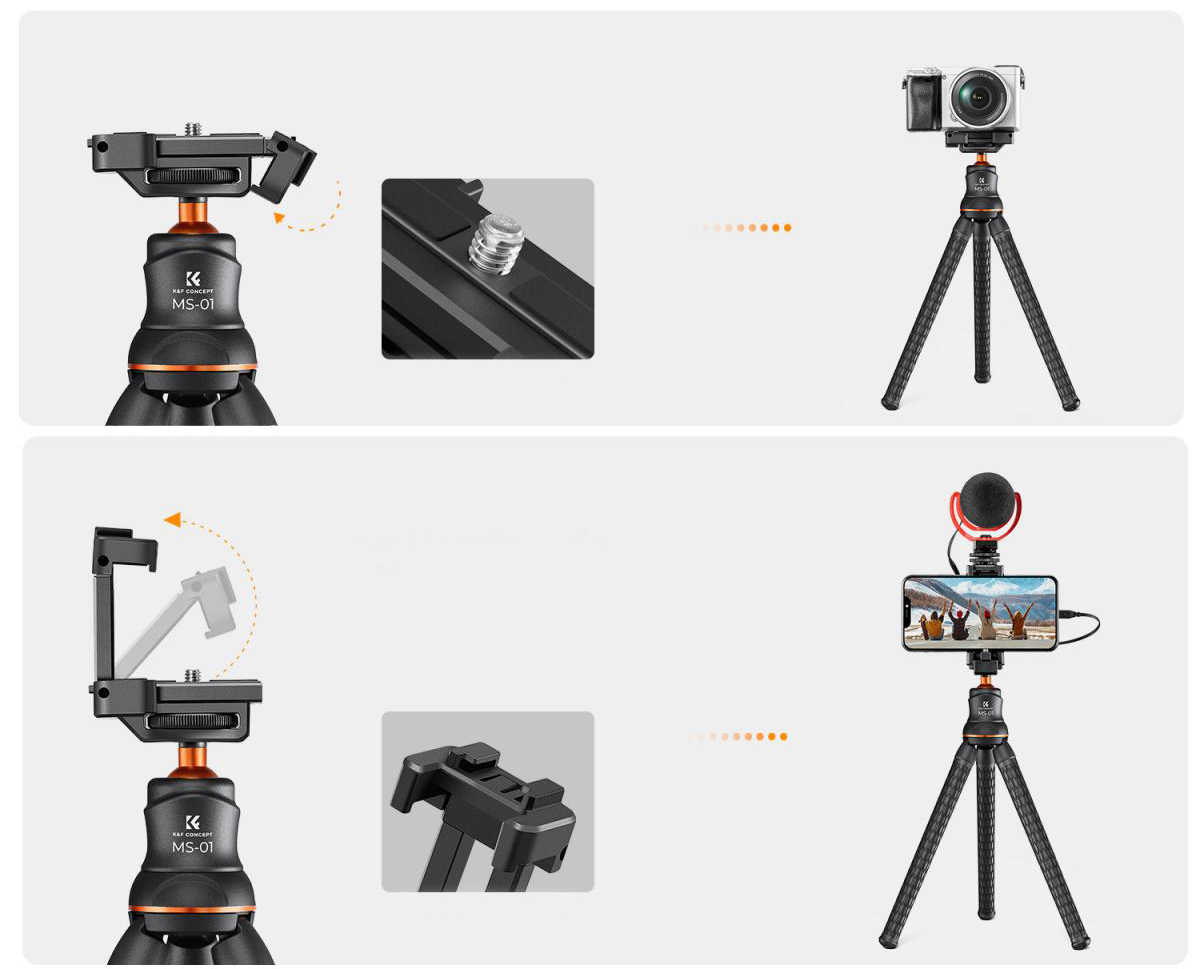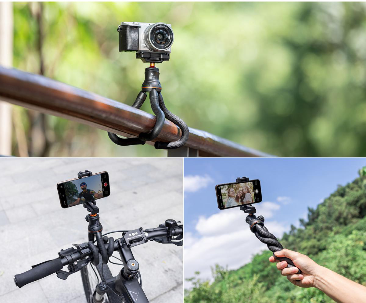 As pernas flexíveis podem ser dobradas à vontade e instaladas onde quiser, como postes de iluminação, grades, galhos de árvores, bicicletas ou cadeiras, etc. Pode tirar fotos nítidas com facilidade e rapidez